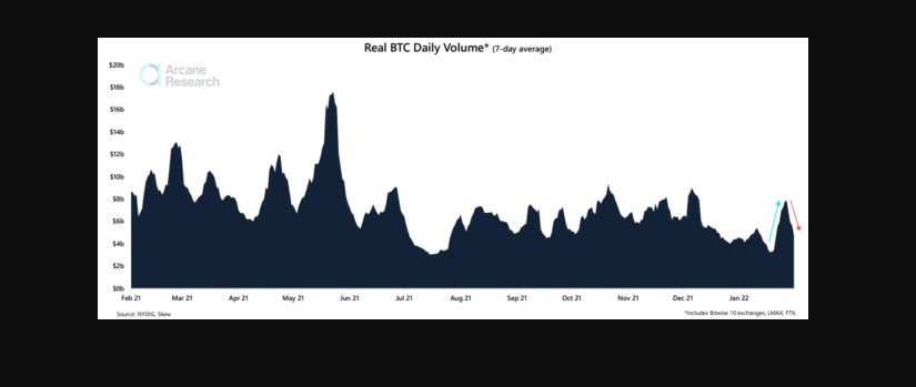 According to Arcane Research's most recent weekly analysis, BTC trade volume has lately dropped sharply and is now returning to “normal” levels following the previous rise.