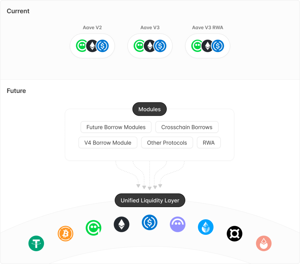 By incorporating a “Unified Liquidity Layer” and a “completely new architecture,” Aave V4 would facilitate the integration of risk modules, isolation pools, and its native stablecoin GHO.”