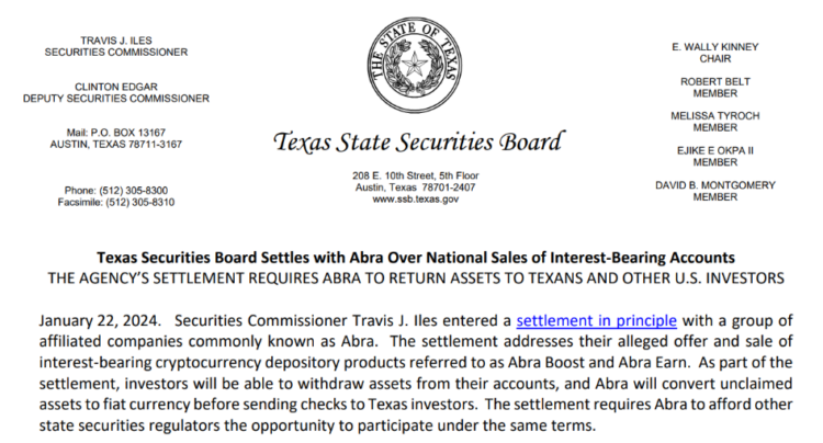 Texas State Securities Board (TSSB) and Abra, a cryptocurrency lending company purportedly insolvent since March 2023, have reached a preliminary settlement. The organization shall reimburse funds contributed by residents of the state.