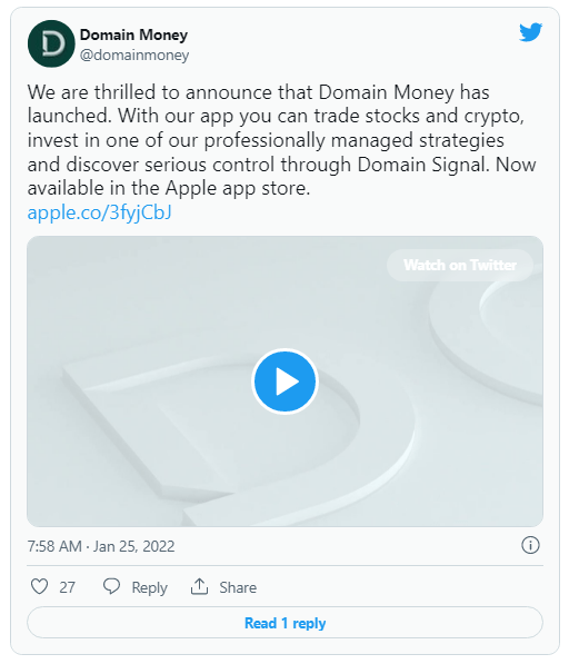 We are thrilled to announce that Domain Money has launched. With our app you can trade stocks and crypto, invest in one of our professionally managed strategies and discover serious control through Domain Signal. Now available in the Apple app store.https://t.co/WDrR4q9W9y pic.twitter.com/89kZ9pTJds
