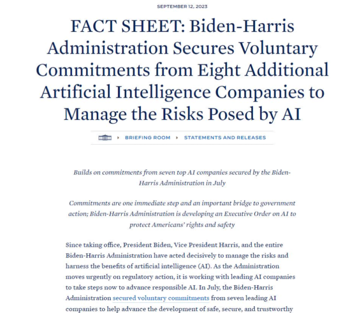 The private commitments endorsed by the Biden administration are viewed as a provisional measure, as Congress has debated potential AI legislation but has yet to make progress regarding introduced legislation or substantial legal changes. Concurrently, the White House is developing an AI-related executive order.