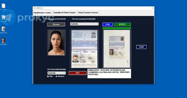 The user in the video generates an AI-generated visage and incorporates the deepfake image into a template of an Australian passport.