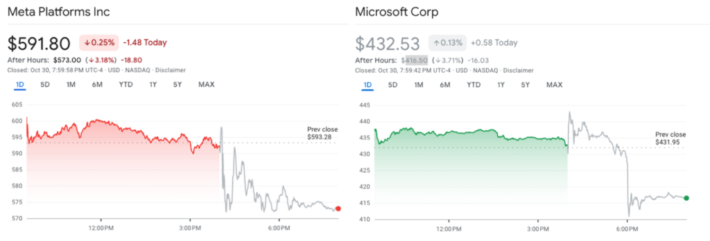 Shares in Meta Platforms and Microsoft declined in after-hours trading on Oct. 30 despite both companies posting strong Q3 earnings, as executives gave lower earnings forecasts and outlined increased spending plans for artificial intelligence (AI).