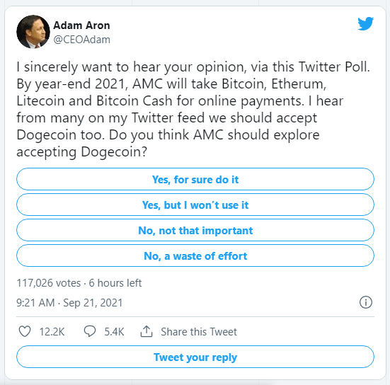 AMC CEO Adam Aron conducted a poll on Twitter today, asking fans if they would use Dogecoin to buy online movie tickets and refreshments at theatres.