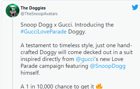 It's Snoop Dogg's Doggie NFT for Gucci, one of 10,000 handcrafted avatars clothed in a costume inspired by the iconic Italian luxury fashion house Gucci's new Love Parade campaign.