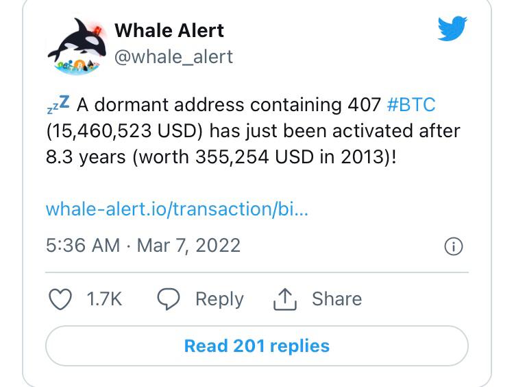Ancient Bitcoin wallet containing 407 BTC ($15.5 million at press time) has been activated for the first time, since 2013, according to data given by Whale Alert.