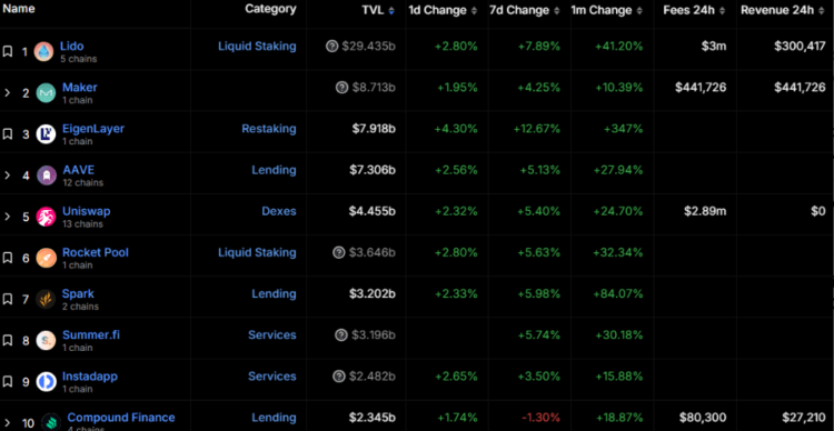 With a TVL of $7.91 billion, EigenLayer is the third-largest Ethereum protocol. As of 2:15 PM CET, EigenLayer's TVL increased by 4.30%, and it has surpassed 347% over the past month, according to data from DefiLlama.
