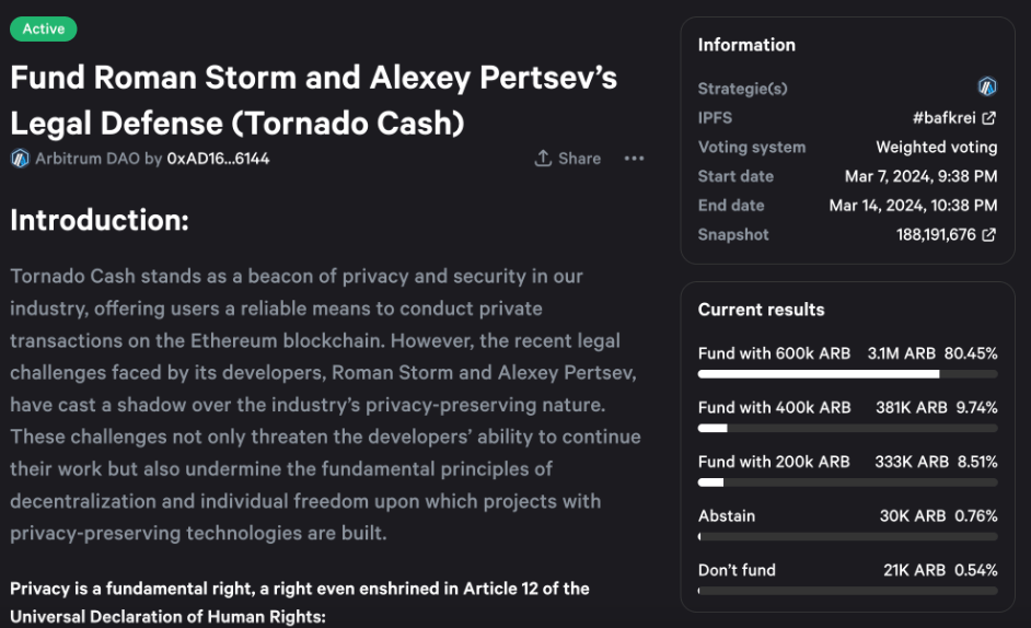 Arbitrum DAO is Voting to finance the legal defense expenses of Tornado Cash's developers. The DAO would donate up to 600,000 ARB tokens in the first year if the proposal is approved.
