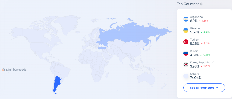 Regarding visitors, Argentina is also the most visited market on Binance, one of the world's largest crypto exchanges. The website traffic from Argentina comprises 6.9% of Binance's total visits, per SimilarWeb.