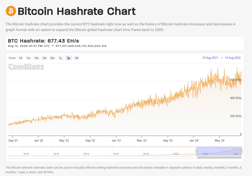 The total hashrate for the Bitcoin network is currently 677.43 EH/s. Source: CoinWarz