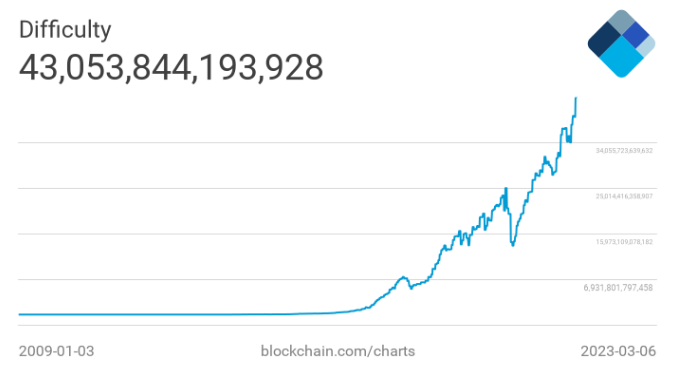 Blockchain.com data shows that the BTC network difficulty has been rising to new all-time highs in February, peaking at 43 trillion on February 25.
