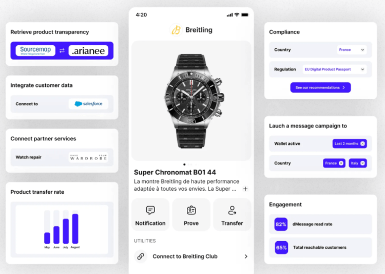Arianee provides the necessary infrastructure for over forty labels, including Breitling, Moncler, Yves Saint Laurent , and Lacoste. On the protocol, luxury watch manufacturers such as Breitling issue digital product passports that provide blockchain-based proof of ownership to their proprietors.