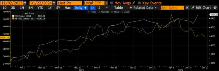 In a prior post today, Arthur Hayes stated that SPX and BTC “ceased rising in tandem after the US BTC ETF.” He foreshadows liquidity issues in the markets as investors await significant macro announcements.