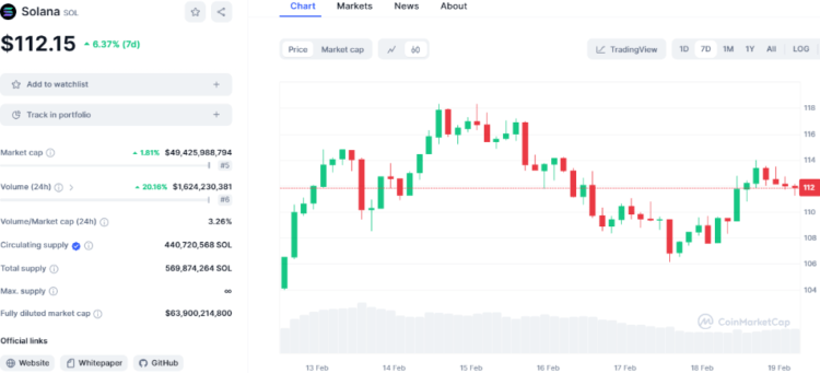 CoinMarketCap data indicates that the Solana token increased 1.71 percent in the twenty-four hours before 10:25 am CET, reaching $112.25. SOL ranks fifth in market capitalization, having momentarily surpassed the BNB token on Binance on February 13.