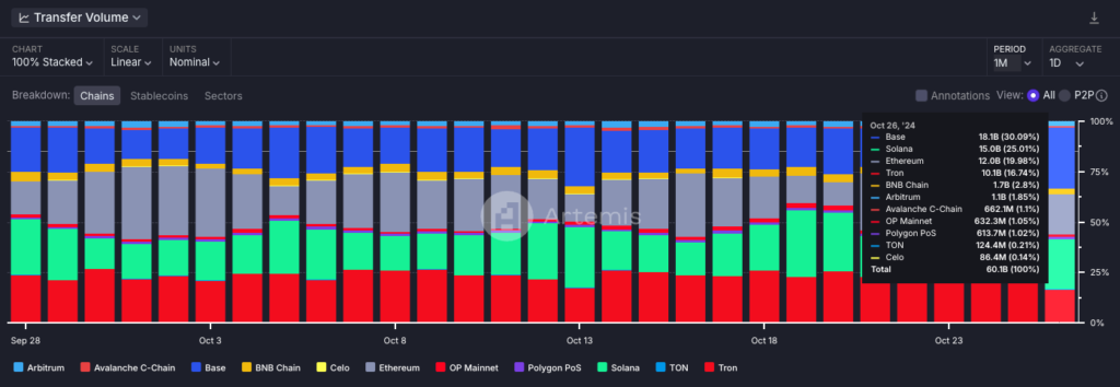 Solana, which contributed for 25% of the one-day stablecoin volume, came in second place, followed by Ethereum, which accounted for 20% and Tron, which earned the fourth spot with 16.7%. Jeremy Allaire, the CEO of Circle, commented on Base's temporary dominance in a post that he made on October 27 on X.