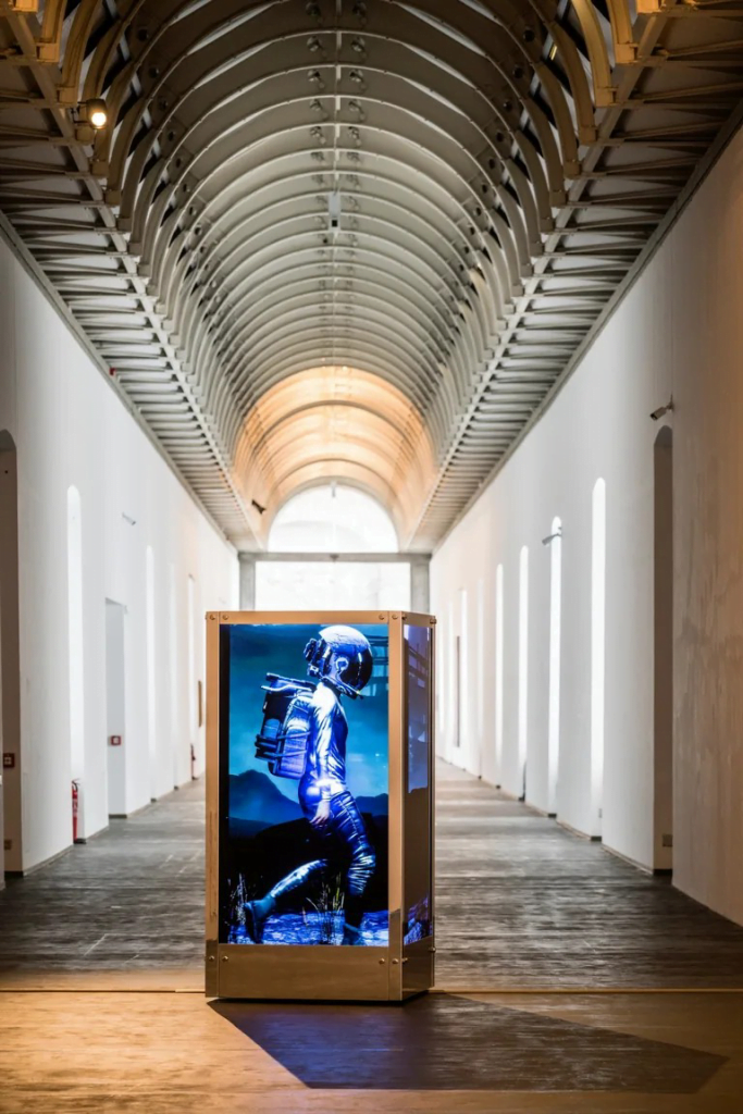 HUMAN ONE, housed in a 7-foot-tall mahogany frame with four slowly revolving LED panels, depicts a constantly unfolding near-future world in which an anonymous astronaut treks towards an unknown goal.