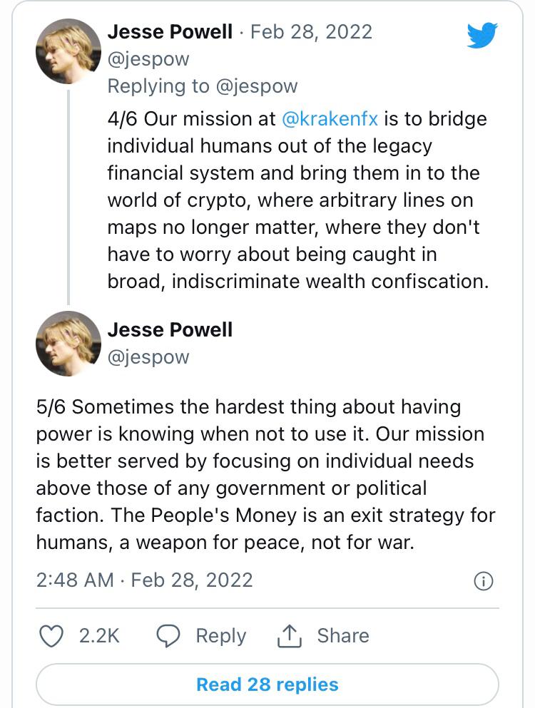 For example, Kraken's chief executive Jesse Powell has stated that the company's platform will not freeze Russian accounts, as doing so would be in violation of Bitcoin's “libertarian values.”