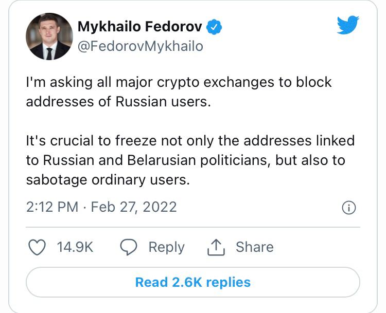 On Sunday, Ukraine's Deputy Prime Minister, Mykhailo Fedorov, requested that major cryptocurrency exchanges restrict the addresses of ordinary Russian users, rather than just politicians, in a tweet posted to his followers.