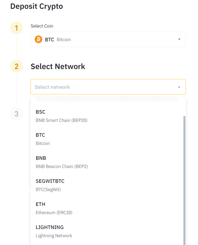 When consumers withdraw or deposit Bitcoin, “LIGHTNING” will be available. BNB Smart Chain (BEP-20), Bitcoin, BNB Beacon Chain (BEP2), BTC (SegWit), and Ethereum ERC-20 are additional choices.