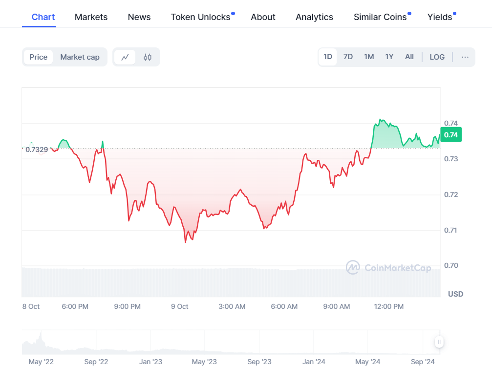 APE's trading volume decreased by 5% to $50.44 million, while its price was up approximately 0.55% and traded at $0.74 at the time of writing.