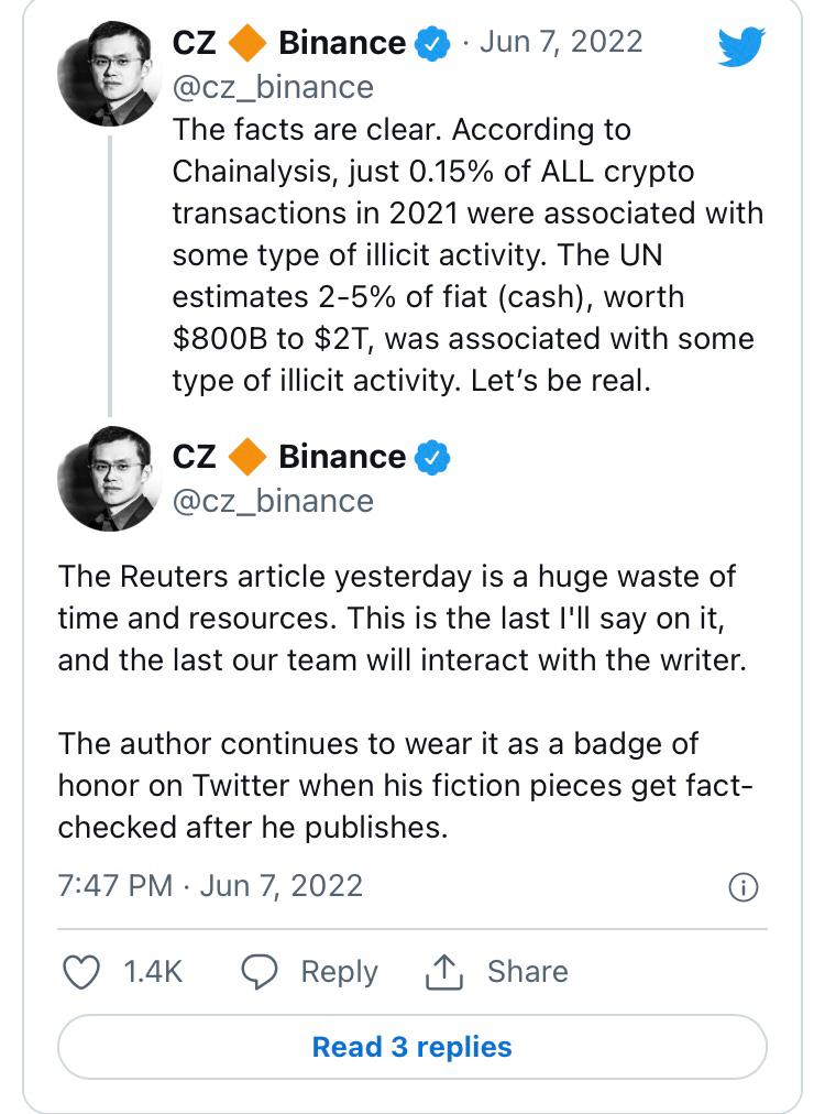 Chagpeng Zhao (CZ), the CEO of Binance, refuted all such claims, citing data from blockchain analytics firm Chainalysis.
