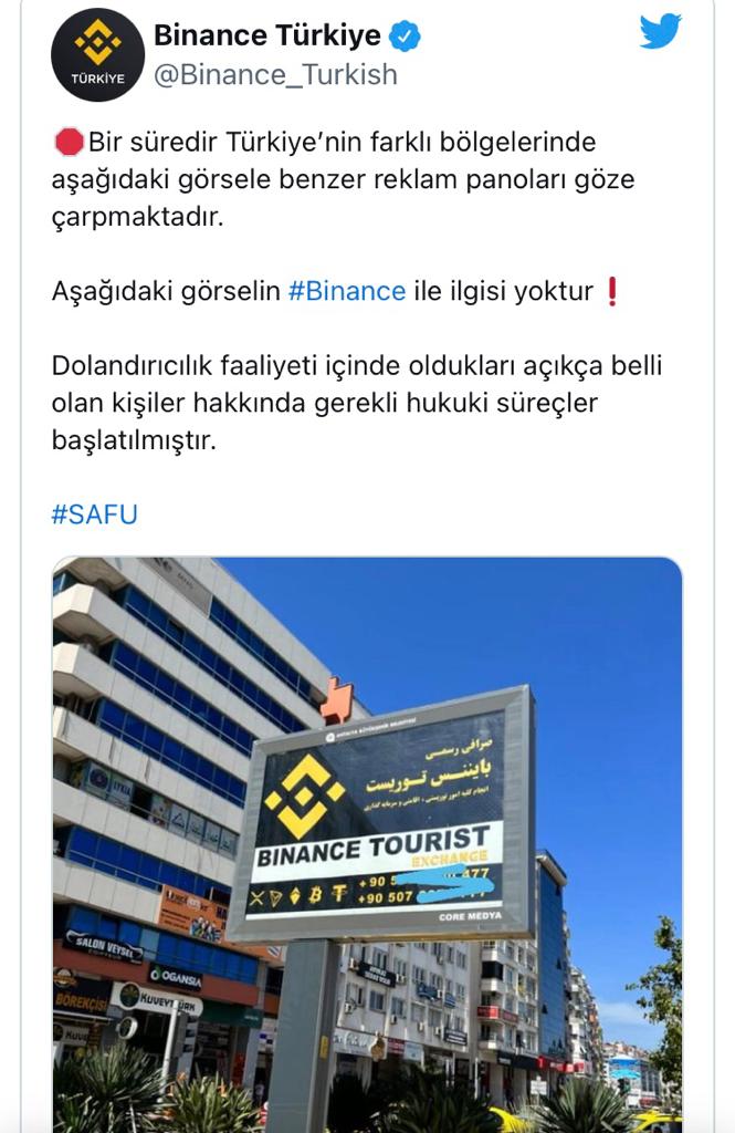 The latest warning issued by Binance Turkey shows a billboard advertising “Binance Tourist exchange,” which has no affiliation with the original company, founded by Changpeng Zhao. The advertisement also contains phone numbers that, when dialed, can connect potential victims to scammers. The warning is roughly translated as follows: