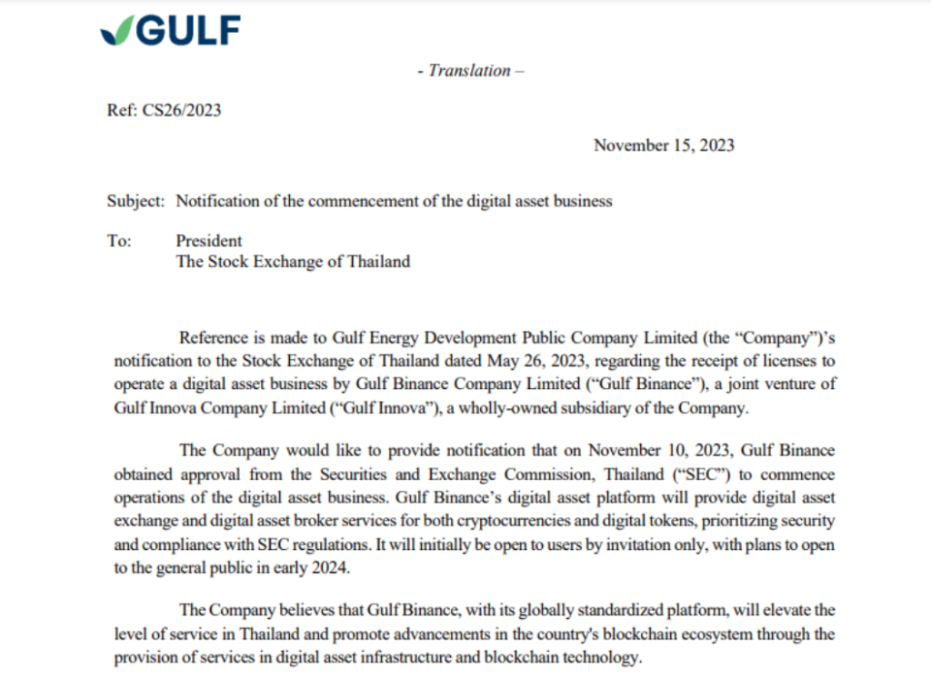 Gulf Energy stated in a filing with the Stock Exchange of Thailand on November 15 that the venture, Gulf Binance, will be made available to the public by early 2024, following an invitation-only launch period. The company received approval from the Securities and Exchange Commission on November 10.