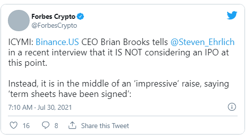 Brooks brought up the first venture financing round while distinguishing Binance.US from Binance.com, and went on to highlight the company's planned private collaborations while noting that the exchange's IPO plans had not changed.