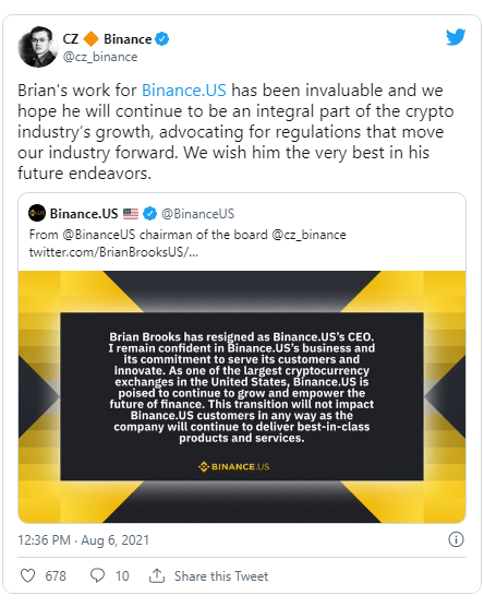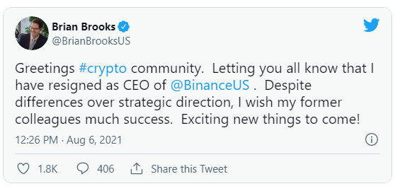 Brain Brooks who replaced Catherine Coley as the the CEO of Binance US, in April has resigned just few months after.