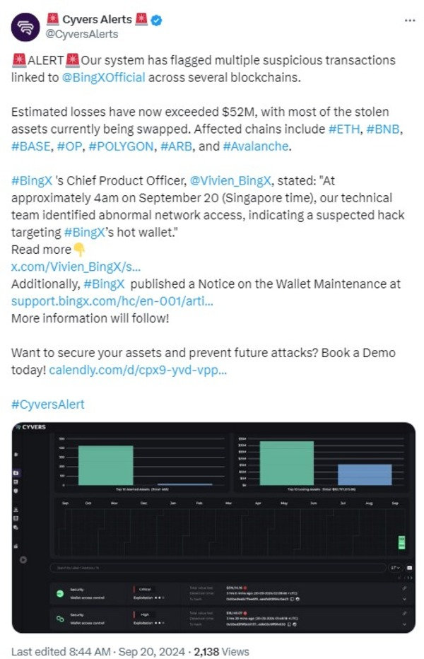 Singapore-based exchange BingX's suspected hack loss has risen to over $52 million, up from initial reports of $26 million.