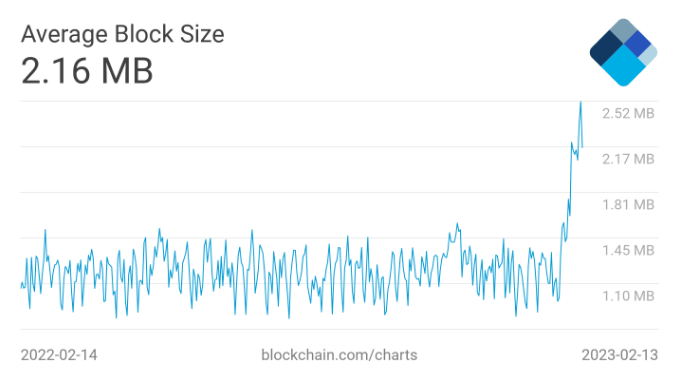From July 2021 to February 2023, the average block size for Bitcoin varied between 0.7MB and 1.5MB. The average block size for Bitcoin topped 2MB for the first time starting on February 5 and is presently hovering around 2.2MB as of this writing.