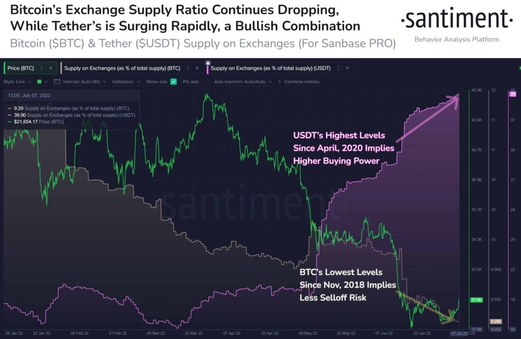 While Bitcoin has been under intense selling pressure over the previous three months, the amount of BTC available on exchanges has been decreasing. According to Santiment , an on-chain data provider: