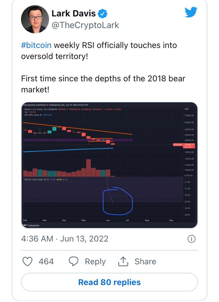 However, some technical indicators suggest that now is the time to add BTC, particularly for long-term holders. According to crypto analyst Lark Davis, Bitcoin's relative strength index (RSI) has entered oversold territory for the first time since 2018.