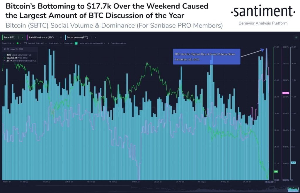 “Bitcoin’s plummet to $17.7k this weekend brought out the most discussion related to the #1 market cap asset in 2022. We often see major price reversals correlate precisely with high social volume rates, and $BTC has jumped +15.8% since”.