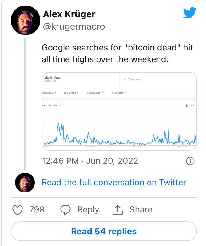 Popular market analyst Alex Kruger discovered that searches for “crypto is dead” had also reached an all-time high.
