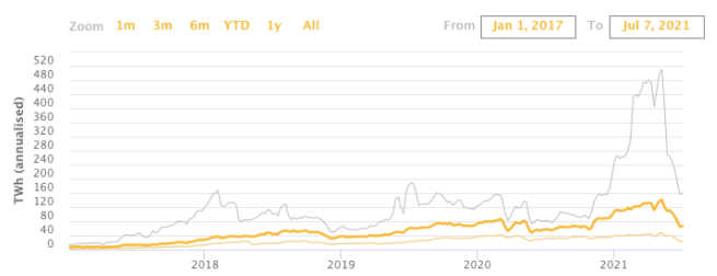 Bitcoin's approximate yearly electricity usage has fallen approximately 60%, from its all-time peak above 143 TWh in May to as low as 62 TWh in early July.