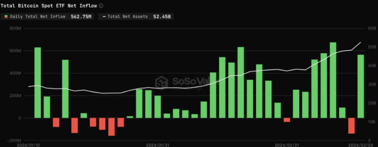 On March 4, United States-based spot Bitcoin exchange-traded funds (ETFs) received $562 million in net inflows as the BTC price surpassed $68,000 and approached its all-time high of approximately $69,000.