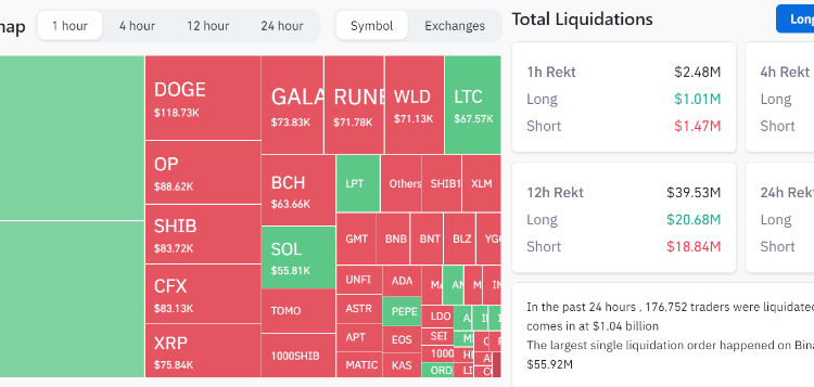 During the price decline, an investor on Binance's ETHBUSD contract was liquidated at $1,434.37, incurring a loss of $55.9211 million. This was the day's most significant liquidation. Another Binance trader on the BTCUSDT contract lost nearly $10 million in liquidations.