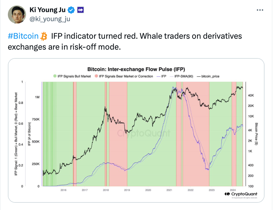 Ju cited the Interexchange-Flow-Pulse (IFP) turning “red” as the cause for this, which monitors the movements of Bitcoin between spot and derivative exchanges, reflecting current market sentiment.