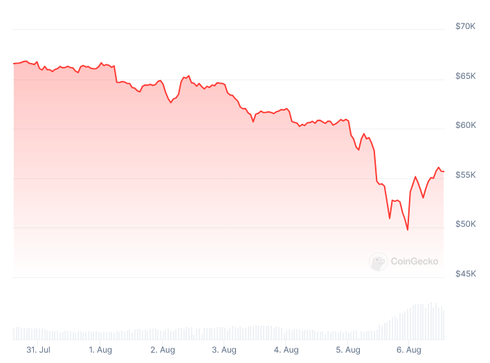 Since BTC reached its lowest point of $49,780 on August 5, according to statistics provided by CoinGecko, the cryptocurrency has largely recovered, climbing 11.85% to $55,680.