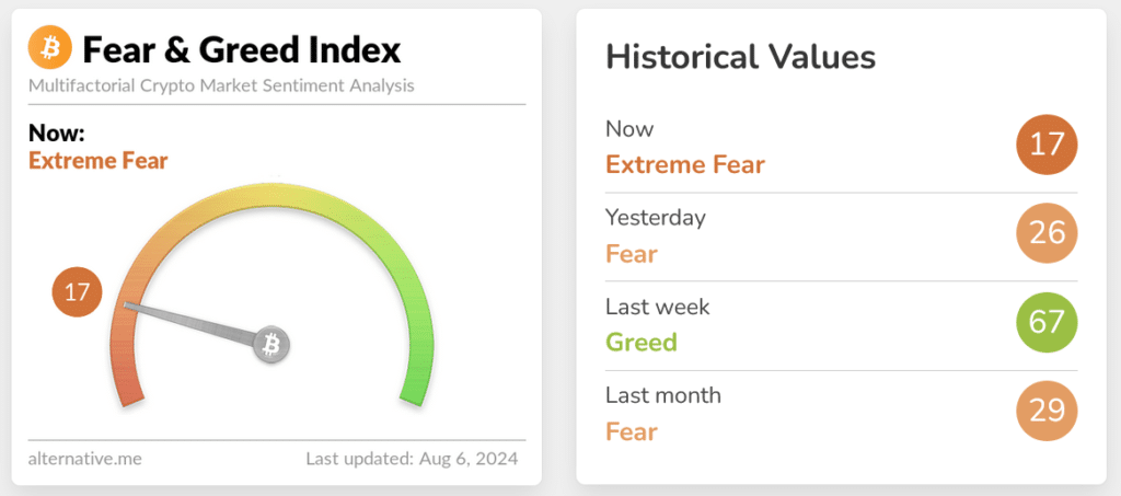 This marks the first time that the index has entered this zone. The index, which tracks market sentiment for BTC and the cryptocurrency sector overall, fell to a score of 17 out of 100 on August 5, the lowest level since July 12, 2022.