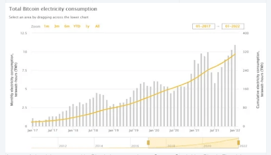 Amount of electricity consumed by Bitcoin in terawatt-hours. Source: Cambridge Bitcoin Electricity Consumption Index (CBECI).