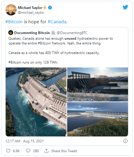 Chairman and CEO of MicroStrategy Michael Saylor, stated in a recent tweet from his official Twitter handle that Bitcoin is a source of hope for Canada while considering the amount of hydroelectric power to mine Bitcoin the country can generate.