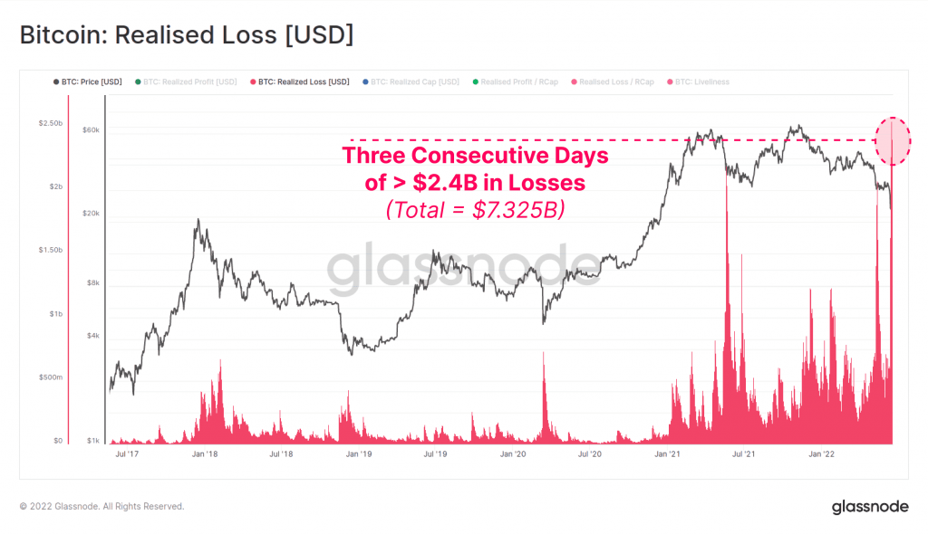 “The last three consecutive days have been the largest USD denominated Realized Loss in Bitcoin history. Over $7.325B in $BTC losses have been locked in by investors spending coins that were accumulated at higher prices”.