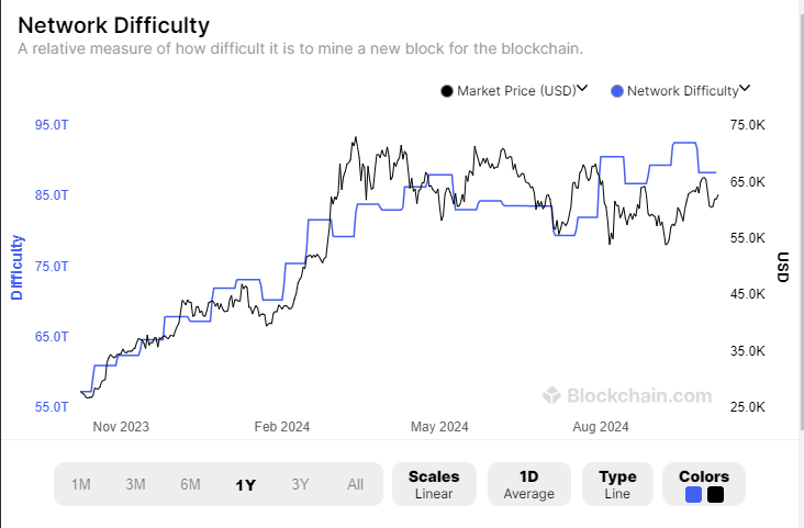 Chart depicting the rise in network difficulty since November 2023. Source: Blockchain.com