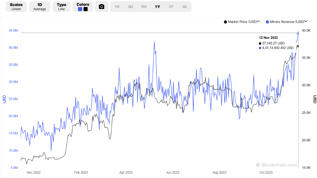 According to blockchain.com data, the daily Bitcoin mining rewards surpassed $44 million on November 12 for the first time in 2023 and since April 2022.