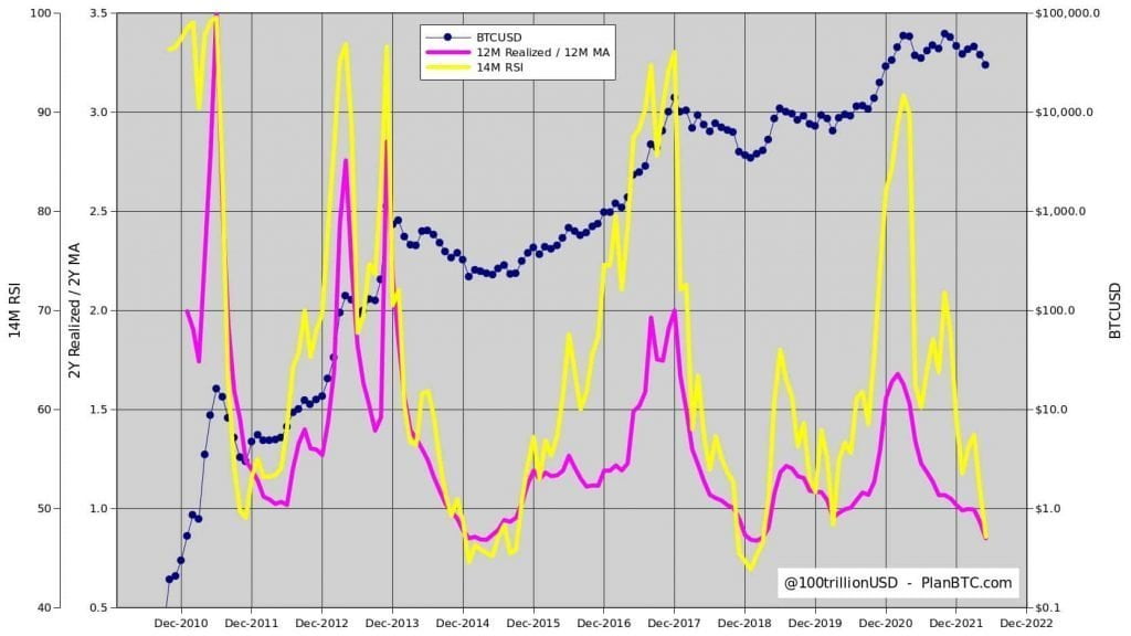 “Realized Price / Moving Average (RPMA, purple) shows the Bitcoin cycle best. Relative Strength Index (RSI, yellow) is similar but can be misleading at critical times (e.g. 2nd half of 2021). The good news: the bear market is almost over. Waiting for RPMA and RSI to start rising again.”