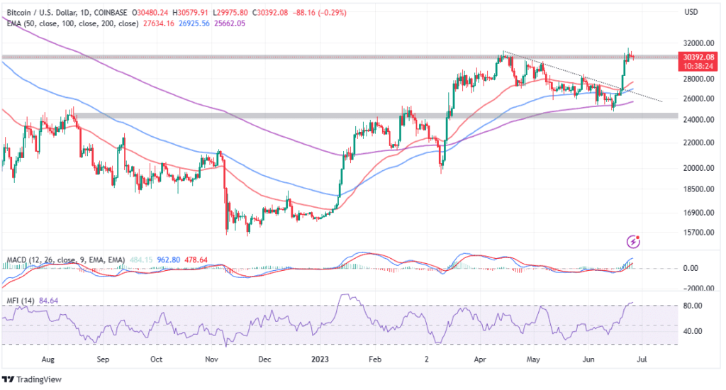 Monday's Bitcoin price is $30,302 after losing 1.1% of its value over the past 24 hours. Over the weekend, the largest cryptocurrency maintained a favorable outlook, with consolidation prevailing above $30,000. Despite aggressive bullish pressure, the Bitcoin price could not sustain gains above its 12-month high of $31,428.