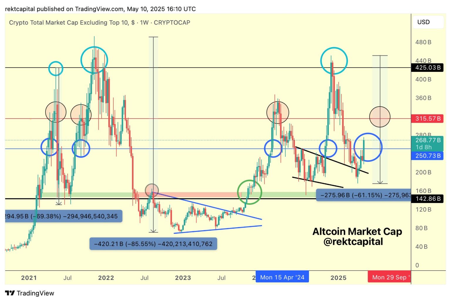 Rekt Capital, a well-known cryptocurrency analyst, has expressed optimism about the altcoin industry. According to him, a breakthrough rally to at least $315 billion would probably be possible if the market capitalization (not including the top ten alts) closed over $250 billion. The analyst added that a weekly closing of that kind would signal the end of the current market decline at -61% and confirm a bottom for altcoins.