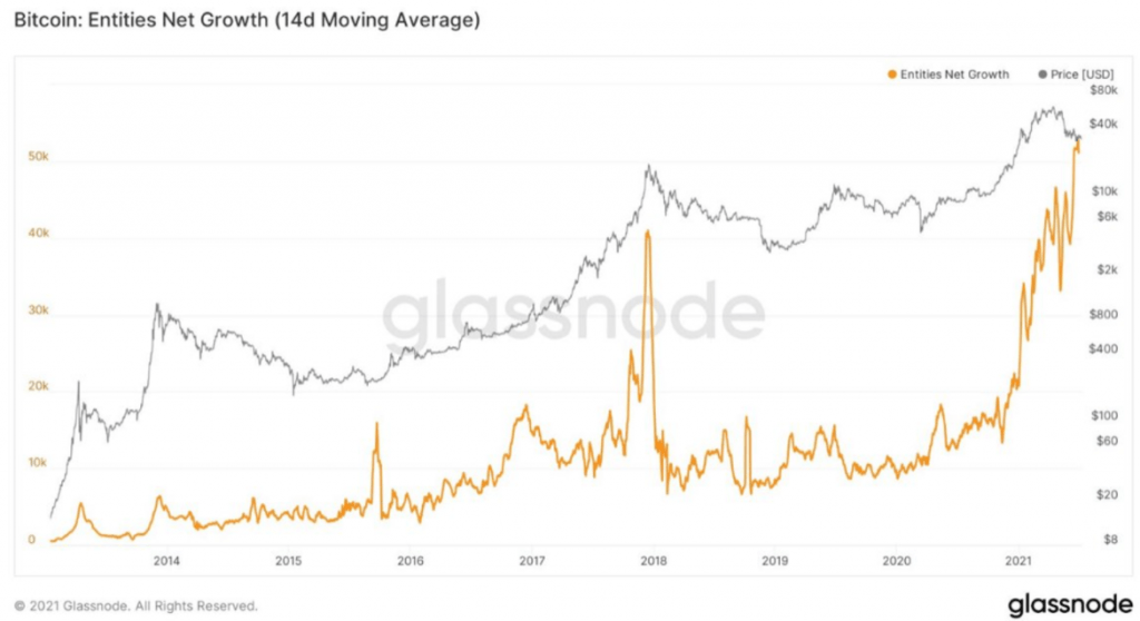 Every day, over 50,000 new entities were seen to be added to the Bitcoin blockchain, and the weekly net growth on the Bitcoin network was higher than that recorded at the beginning of the year, when the prices of bitcoin were beginning to reach new highs.